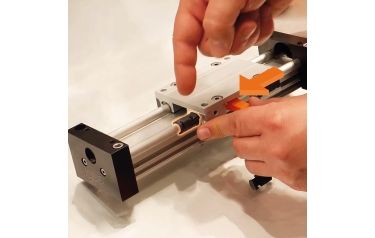 The principle of the replacement liner is quite simple: First, the side cover of the linear housing is loosened using a screwdriver. With the free tool supplied, the liner is pushed out of the carriage and removed. The replacement liner, which is made of the wear- and abrasion-resistant iglidur J200 material, is clipped onto the rail and inserted into the carriage with the assembly tool. Put the side cover back on the linear housing and the bearing change is finished in no time.