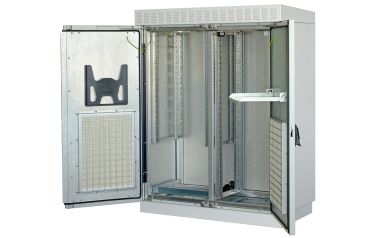 The aluminium profile frame and double-walled design of the cabinet offers rigid structural stability with a static load of 400kg. The particularly robust design is further realised by corner blocks integrated in the cabinet frame and by aluminium profile hinges for the doors. The cabinet has passed all relevant shock and vibration, wind as well as seismic tests with very good values.