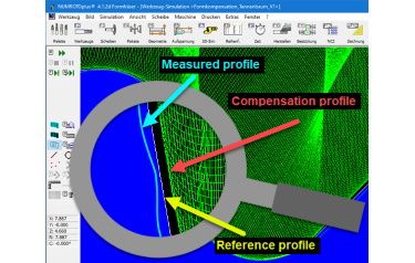 The form compensation software employs advanced filtering algorithms to create a very smooth and precise compensation profile. The software always calculates the orientation of the grinding wheel and the path speed from the original profile, so that only the position of the contact point on the cutting edge is compensated – and not the orientation of the grinding wheel. This ensures that the surface quality of the tool is unaffected by the compensation.