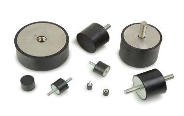 Vibration isolation mounts have a threaded stud or tapped hole on both flat ends to connect two parts of a machine. Rubber bumpers have a threaded stud or tapped hole on one end and a rubber jacket over the other to act as end stops or mounting feet.