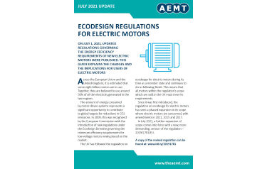 The AEMT’s guide to the ecodesign regulations for electric motors can be downloaded from www.theaemt.com/technical-info/motor-eco-design-efficiencies