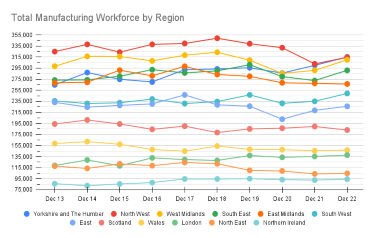 Its workforce is now larger than the North West, which has fallen to second place, with a total of 314,483 people working within manufacturing, a dip of 11,779 from December 2021.