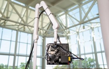 The moveable armature enables many degrees of freedom to view the various regions of the body. Inside the optical head are also programmable fast-steering mirrors that automatically position the source and receive laser beams to establish the ultrasound array precisely.