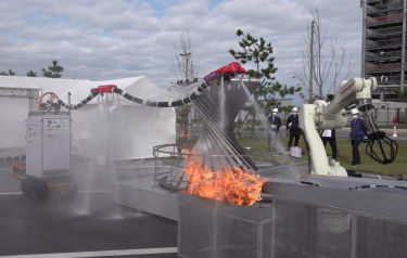 The Dragon Firefighter received its baptism of fire at the opening ceremony of the World Robot Summit 2020 (WRS2020), held in September 2021 in Fukushima. There, it successfully extinguished the ceremonial flame, consisting of fireballs lit by another robot, at a distance of 4m.