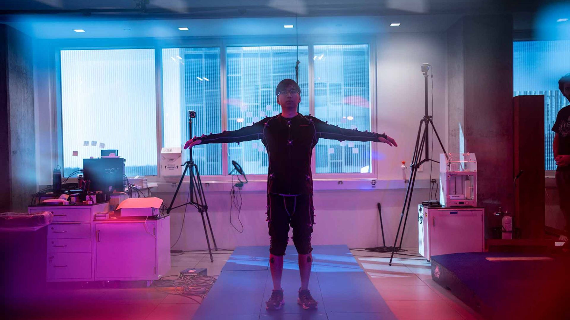 Participants performed walking and sit-to-walk tasks while wearing a black form-fitting motion capture suit covered with 68 reflective markers. Their movements were recorded by a 16-camera motion capture system.